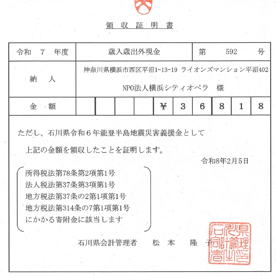 2025年度募金活動のご報告 2026年4月17日 最終更新日時 : 2026年4月17日 cityopera 2025年度募金活動のご報告 お預かりした全額を、石川県令和6年能登半島地震災害義援金として募金いたしました。